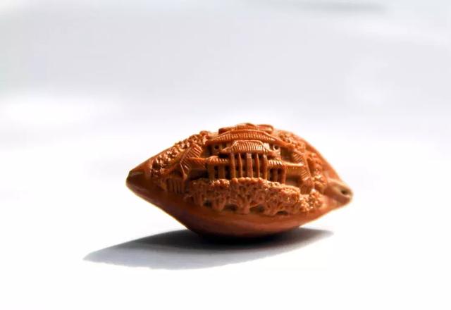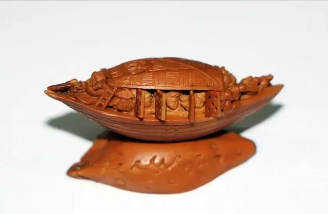 据介绍,端详这条用橄榄核雕刻而成的小船,长而窄,色泽明丽,由船身和下面的波浪两部分组成。船头到船尾不到三厘米长,约有两个黄米粒那么高。中间高起而开敞的部分是船舱,船篷覆盖着它,雕刻线条十分细腻。小船开启四扇雕有花纹的小窗,透过窗户可见小船里的四位游人矫首昂视,神态怡然。