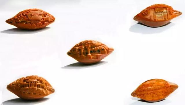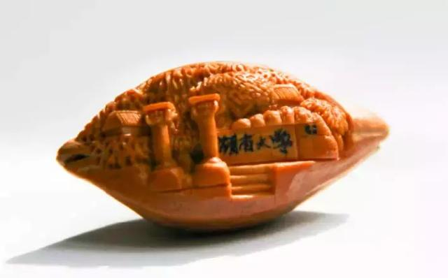在直径两厘米左右的橄榄核上,湖南大学科学馆(今校办公楼)、大礼堂、老图书馆(上世纪50年代重建)、岳麓书院、校门(江边)等校园建筑,微缩于方寸之间,线条错落有致,仿佛有一种安静的力量。那罗马式的拱券造型、中国传统坡屋顶设计,那飞檐的角度、屋脊的走向……李少军雕刻出了建筑美学的张力,也诉说着他与千年学府的故事。