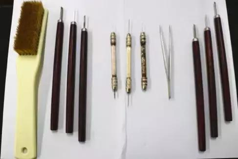 “为了雕这个窗户,我做坏了十几个了。做好后安装上去也费了不少功夫,窗户的中轴必须插进槽中,完全吻合才可以。”为了做核雕,李少军还专门自制了一套工具,是由缝衣针磨制而成。有时为了便于雕刻人物神情,一根针他要磨上十几天。