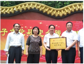“湖南省君子文化研究会践行基地”授牌仪式,会长李利君(左二)、执行会长魏忠胜(右一)出席。