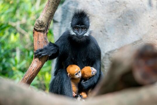 这次黑叶猴自然交配顺利产下两只小仔并成功自然哺乳,得益于长隆一直致力保护国内的珍稀物种,不但种植了黑叶猴常吃的多种植物,展区也高度仿照其野外的生存环境,有洁净的饮用水、可以任意攀爬玩耍的乔木及石山,夏天还有降温设施;更重要的是,长隆已开展多年的动物医疗训练,使动物对正常的体检与保健治疗不再恐惧,主动配合兽医与饲养员,形成了较好的脱敏效应,饲养员可以近距离对“笑笑”喂食,同时可以仔细观察小仔的变化,对保证成活起了重要作用。