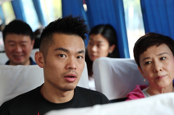 林丹坐在去天河机场的大巴上 武汉体育中心团队为国羽送行