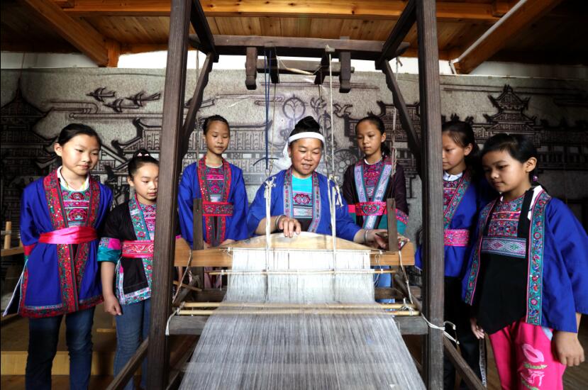 5月18日,在三江侗族自治县同乐苗族乡同乐村平溪屯,几名小学生在三江侗绣博物馆内参观。