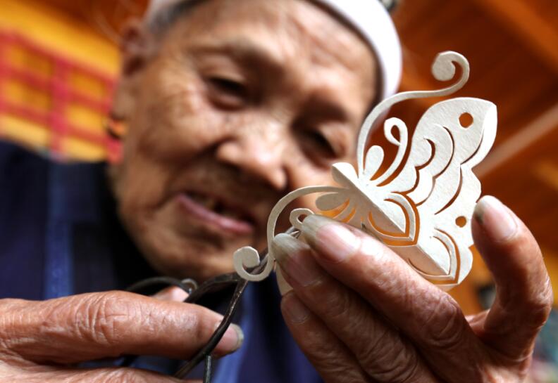 5月18日,在三江侗族自治县同乐苗族乡同乐村平溪屯的三江侗绣博物馆内,一名绣娘在剪纸。