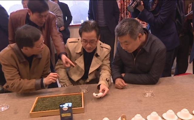 杭州市下城区委书记陈卫强(中)、中国农科院茶叶研究所研究员尹军峰(左)和湖北巴东县委书记单艳平(右)鉴赏(评)“巴东郡贡茶”(供图 湖北巴东县农业局)