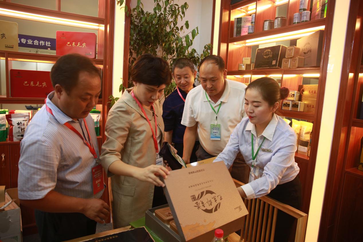 2017年湖北巴东县长郭玲(左二)等领导在恩施国际茶业大会现场推介“巴东郡贡茶” (摄影向勇) 国际制茶大师、国家级“恩施玉露”传承人杨胜伟(右)指导研制“巴东郡贡茶”(摄影 向勇)