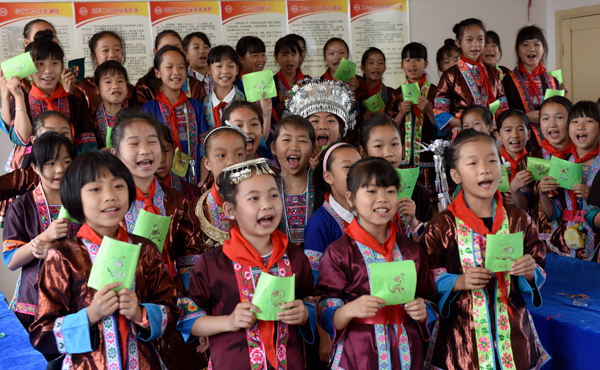5月24日,在三江侗族自治县古宜镇中心小学,学生们在展示侗族刺绣作品。