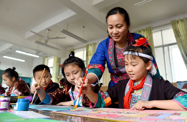 5月24日,在三江侗族自治县古宜镇中心小学,一名老师在教学生画侗画。