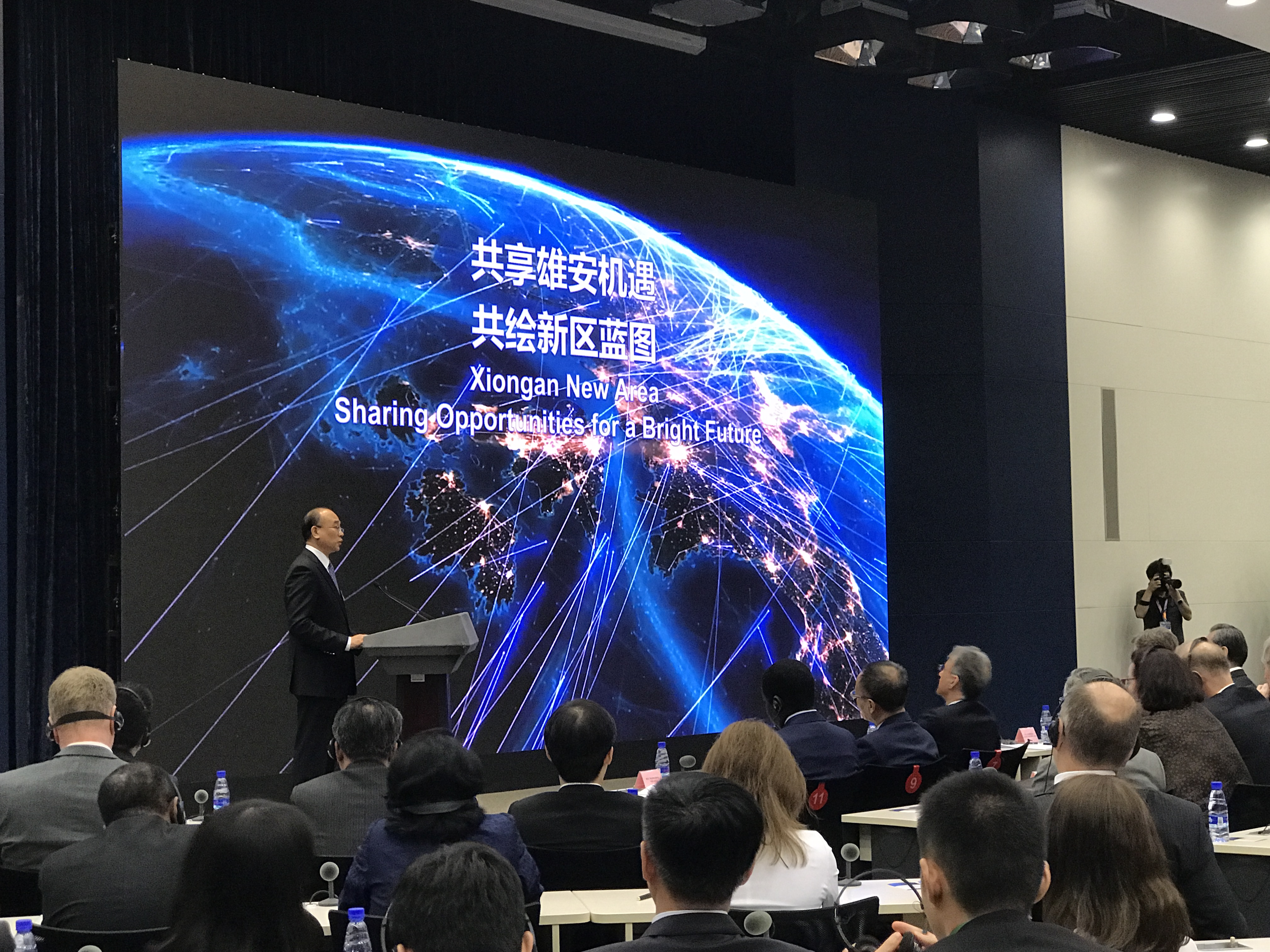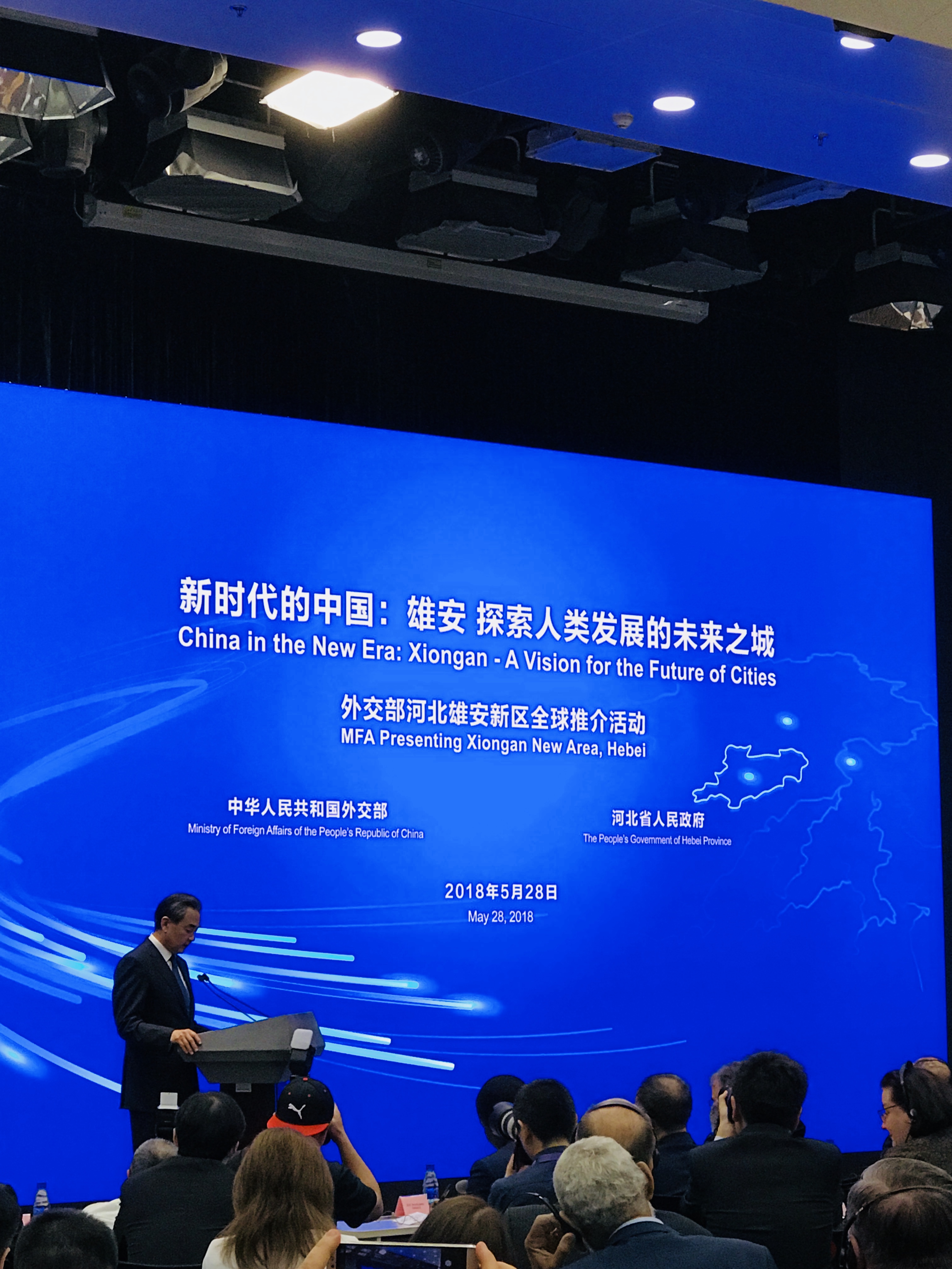 國務委員兼外交部長王毅在致辭中說,新時代雄安新區將成為中國未來高質量發展的全國樣板。近期出台的雄安新區計劃綱要明確了雄安新區是綠色、生態、宜居新城區,創新驅動發展引領區、協調發展示范區、開放發展先行區。他稱,雄安新區代表了中國的未來,引領了世界潮流,雄安新區是中國深化改革的重大舉措,大量符合未來發展發向的舉措將在雄安先行先試,以解決大城市病,爭取走出一條可複制可推廣的新路子。
