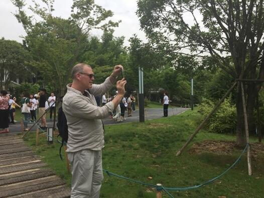 来到东湖边,海外大V们乘坐小型电瓶车沿着东湖绿道徐徐前行,遇到特色景观,便下车步行踏访。在“湖光序曲”参观点,澳大利亚国际关系专家杜甫温对湖边的这片湿地看得特别仔细,总是抓住机会就向身边的工作人员询问。据了解,杜甫温在迪肯大学教授传播学及国际关系等课程,在“一带一路”、中澳关系、国际教育合作及旅游发展等方面有较为深入的研究。
