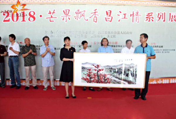 县委常委、宣传部长文艳参加开幕式,并代表县委县政府接受汤虹捐赠书画作品。汤虹告诉记者,他的父亲2014年来过昌江并观看了当年的木棉红摄影展,对昌江木棉很是赞赏,也想为昌江画点什么,于是便有了这幅今天赠送给昌江的“南国春来早”。