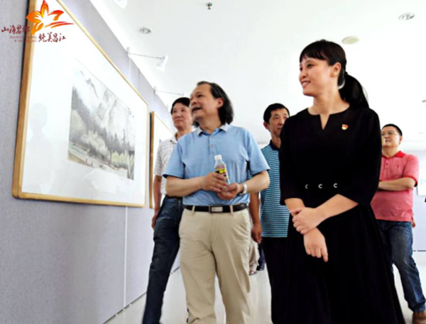 文艳陪同受邀嘉宾观看书画展(李科爽摄)