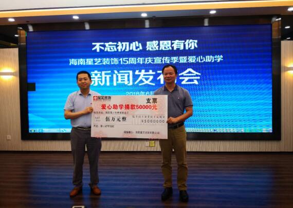 当天下午,在星艺装饰海南总部--海口"居然之家"7楼举行的"海南星艺装饰15周年庆宣传季暨爱心助学新闻发布会"上,海南星艺装饰有限公司总经理柯宗石将5万元支票郑重交到海南青少年希望基金会副秘书长吴日新手中,并表示"海南星艺装饰扎根海南15年,能取得今天的成就离不开社会各界的关爱与支持。回报社会是我们一直秉承的理念,今后将在力所能及的范围内继续开展更多的爱心活动,用实际行动体现出企业的责任担当。"