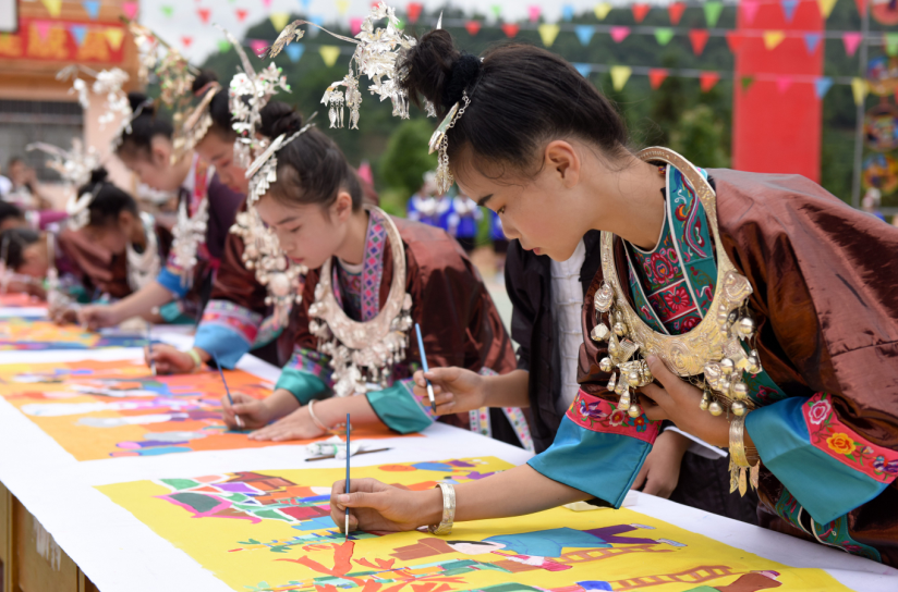 【香港商报网讯】记者唐琳 通讯员龚普康报道:6月2日,广西柳州三江侗族自治县独峒镇举办第二届侗族农民画文化艺术节,当地群众以侗画展、文艺汇演、现场创作等多彩节目竞展风情,吸引桂湘黔三省区众多游客前往观赏体验。