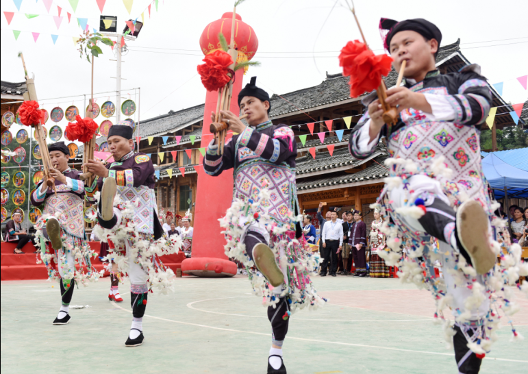 6月2日,在三江侗族自治县独峒镇独峒村,人们在表演芦笙踩堂。