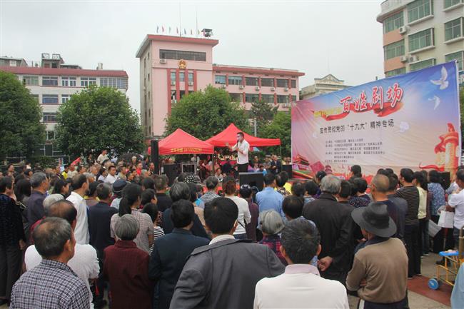 舞台上,本地“盛淼”花鼓剧团表演的小品《赖脱贫》,再现了一个贫困户从等靠要蜕变成养殖致富能手的故事,诙谐夸张的表演寓教于乐,让观众大呼叫好。现场一老年观众胡信全看完演出后还久久不愿离去,他说:“我们老百姓就喜欢看这样的节目,接地气!”