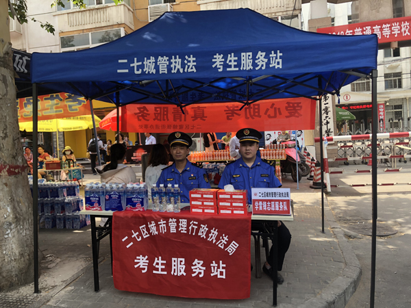 郑州市二七区城管助力高考,为广大考生提供矿泉水、笔、卫生纸等用品