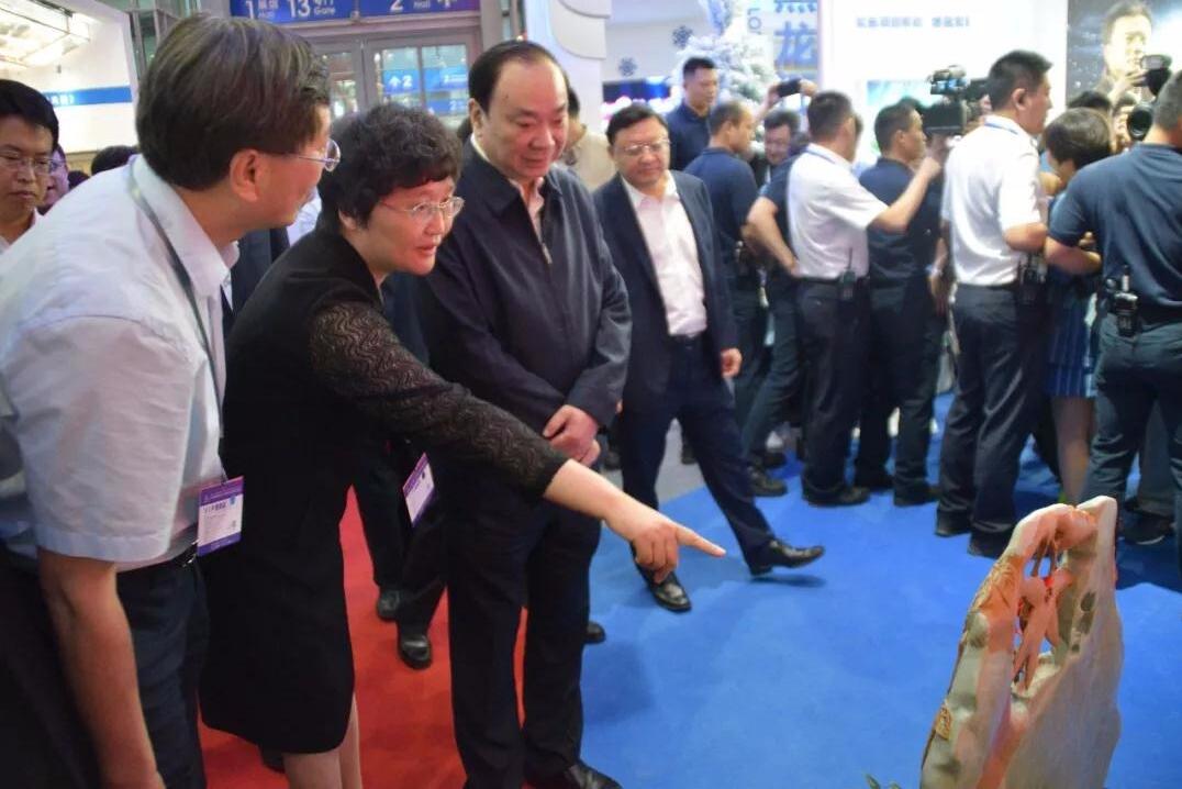 中央政治局委员、中央书记处书记,中央宣传部部长黄坤明(右二)在吉林省委常委、宣传部长王晓萍(中)陪同下参观八吉松花石艺术品。