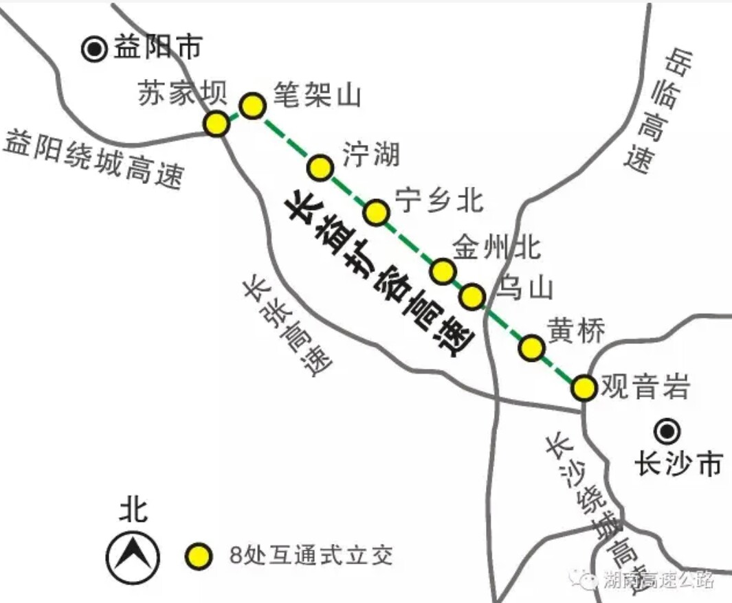 全線共設置觀音岩、黃橋、烏山、金州北、寧鄉北、濘湖、筆架山、蘇家壩互通立交8處,收費站5處,服務區1處。項目建成後,將增加長沙主城區“西大門”出入口,大大緩解現有長益高速公路交通壓力。
