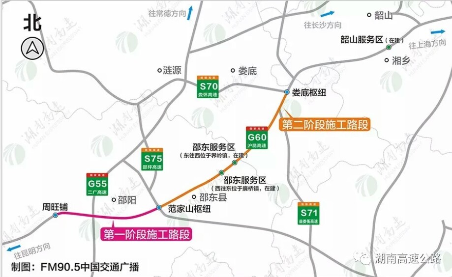 2014年湖南省发改委批准,项目分两期实施。一期工程为起点至娄底互通102.1km,二期工程为娄底至周旺铺段118km,其中一期工程已于2016年11月30日建成通车。另新建隆回、邵东、韶山三对服务区,其中隆回服务区于2017年2月14日建成投入运营。