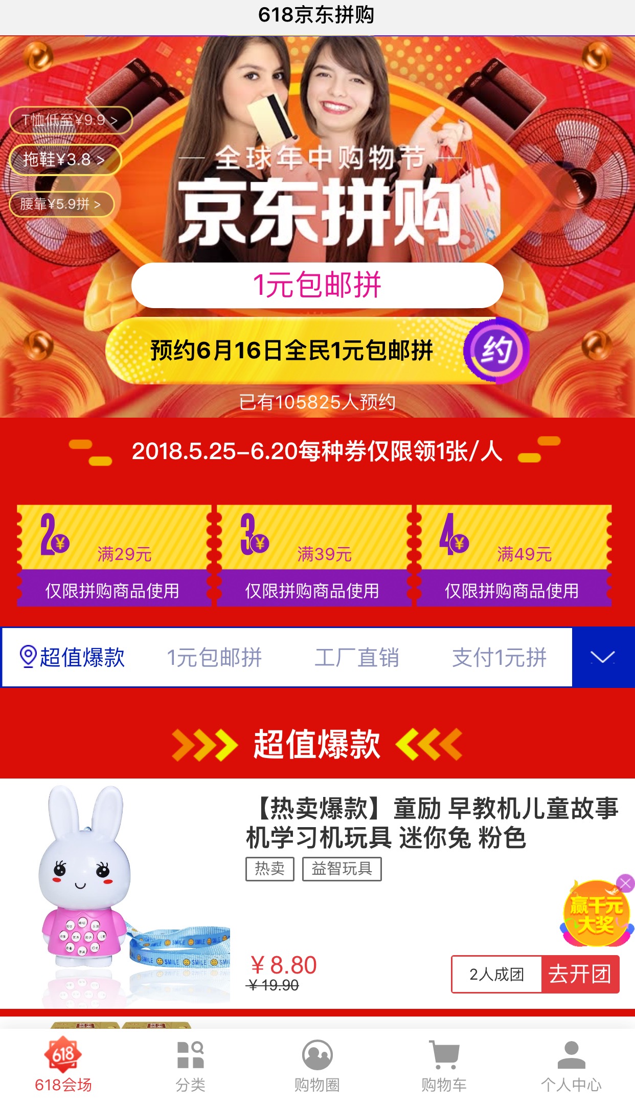 据京东拼购负责人介绍,今年618京东拼购活动在京东微信、手Q购物、京东拼购小程序、京东购物小程序、京东APP、M站六大渠道全面展开。玩法包括新人1元包邮拼、9.9元好货包邮拼,抢拼500万免单名额与1亿红包券发放,还有明星发红包,育儿、美妆、职场、运动户外等六大主题商品抢拼活动等。