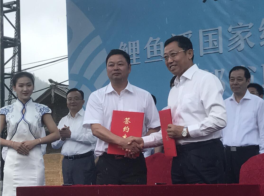 农业农村部渔业渔政管理局局长张显良、周宁县人民政府常务副县长雷立雄就部地战略合作进行签约。