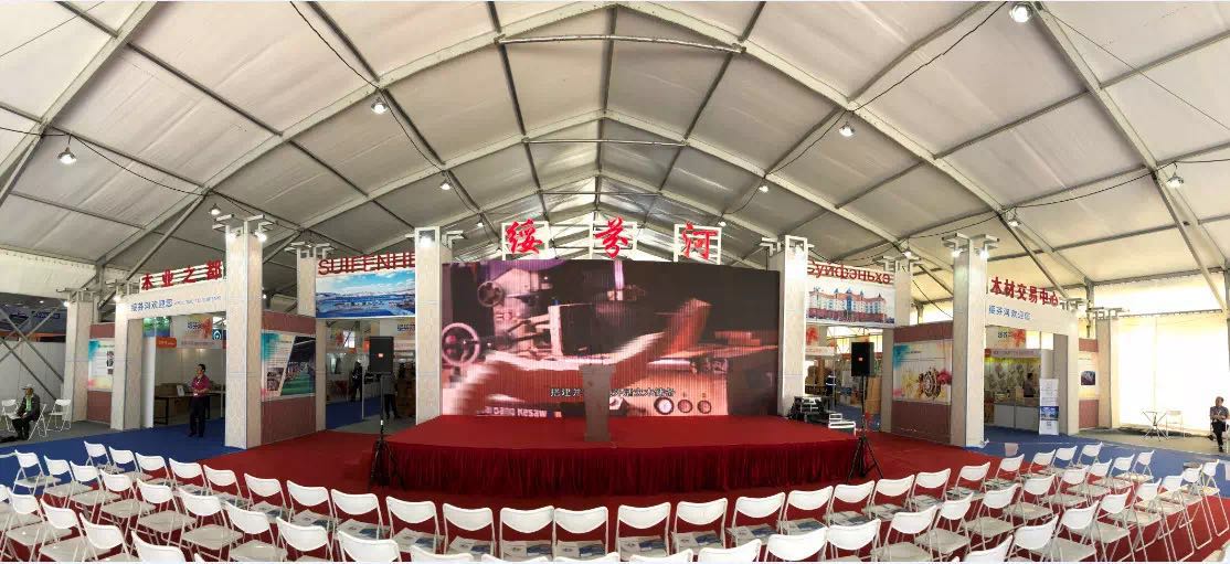 室外篷房内的900平方米特装展馆,展示了绥芬河的木材产业。以“绿色、生态、环保”为主题,造型通透、大气,寓意绥芬河敞开怀抱,欢迎海内外客商投资合作。展馆前半部分为形象展示洽谈区,主要展示绥芬河形象、丰富的木材资源和口岸特点,后半部分为企业宣传展示区。