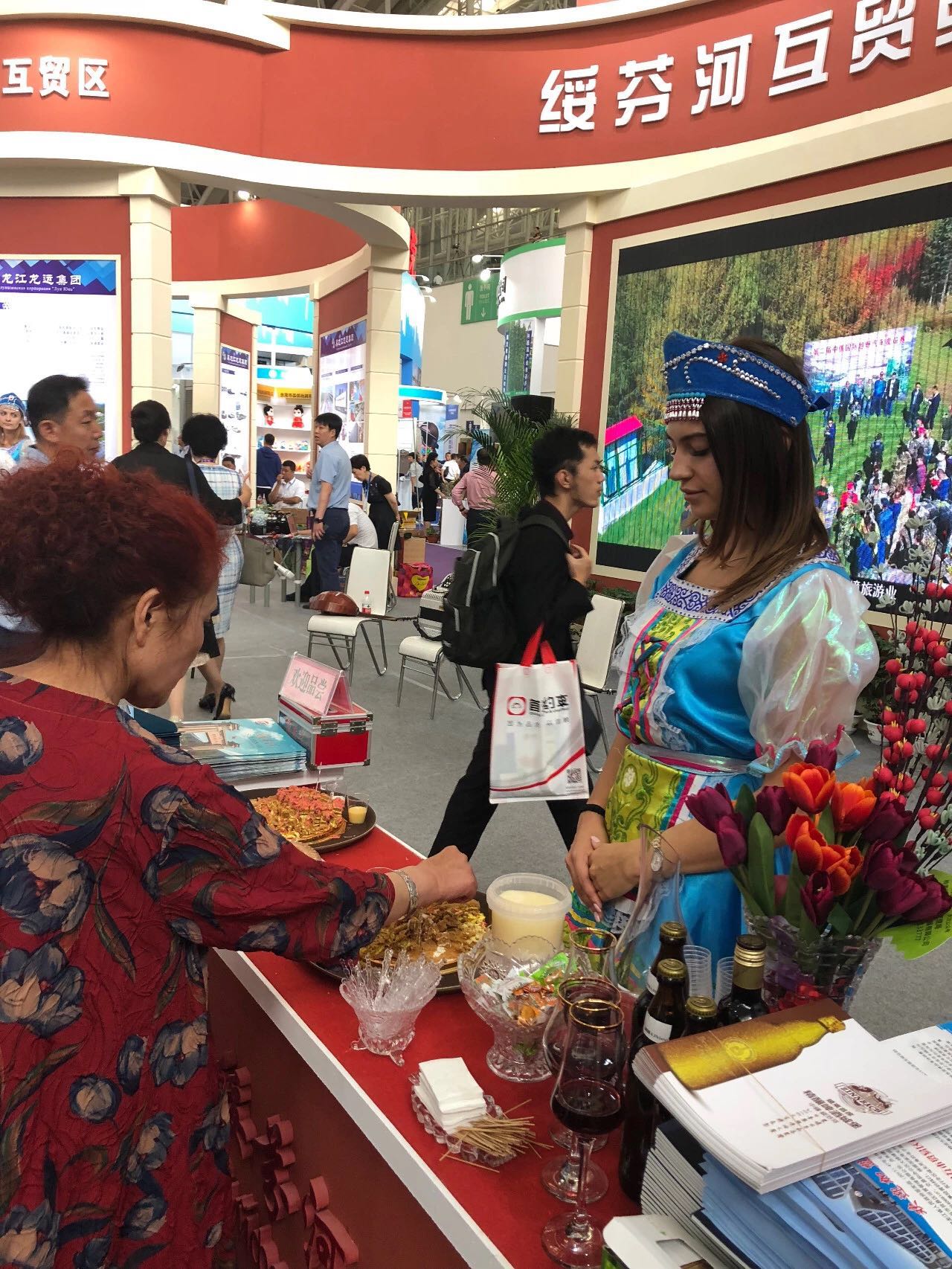 B厅内经营俄罗斯商品的绥芬河企业,备受中外游客的青睐;C厅内牡丹江的展馆里,来自绥芬河的紫金枫木业、维多宝公司也广受好评。(尹金婵/文 吴惠娟/摄)