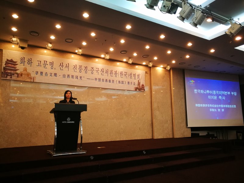 推介会由专业的韩语导游作推介员,围绕黄河、长城、太行三大旅游板块介绍山西丰富多彩的旅游资源及近年来山西旅游业的发展情况,并向韩国民众发出邀请,热情欢迎韩国游客到山西旅游观光,其专业的推介引得现场观众阵阵惊叹和掌声。山西宝华盛世国际旅行社进行了山西旅游线路产品推介。此外,推介会还播放了山西旅游宣传片,绵山和通天峡景区进行了山岳主题景区推介,现场还进行了抽奖活动,送出布老虎、平遥推光漆器等山西特色旅游纪念品。