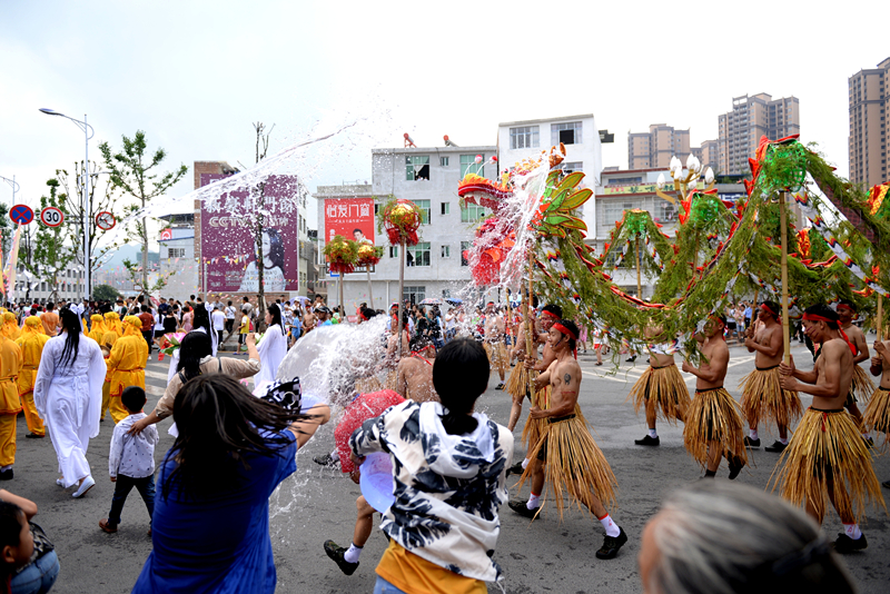 记者当天在现场看到,水龙主要由刺竹、龙须草等手工扎制而成,水龙表演由水龙、罗汉、渔翁、船女、虾兵蟹将、金童玉女等角色组成。当水龙走街串巷舞动翻腾时,全城市民泼水狂欢,所到之处每家每户用瓢、桶、盆、水枪等尽情地向舞龙者和龙身狂喷泼洒,男女老少相互泼水、嬉戏打闹,大街小巷欢声笑语、场面壮观热闹。