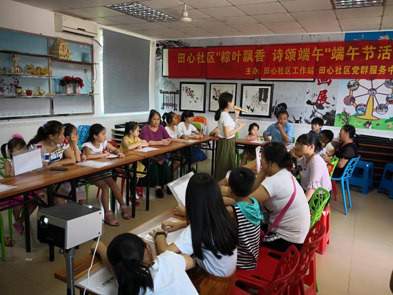 活动现场,田心社区用PPT形式讲解了端午节的由来和习俗活动,还准备了蕴涵端午相关知识的诗歌若干首,引导社区亲子家庭缅怀先贤,学习其忧国忧民的博大情怀、忠诚祖国的高尚品质,弘扬传统美德,让少年儿童在诵读中热爱经典、亲近经典、熟知经典,提高对民族文化的认同感和自豪感。活动既联络亲子感情、营造亲子家庭欢度端午节的文化氛围,又促进了少年儿童对传统文化的热爱与传承,丰富了精神文化生活。