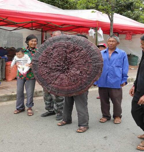 据介绍,这是朵外形呈椭圆形、通体紫红、大如伞盖的灵芝。经现场测量,它直径1.05米,重达10公斤左右。灵芝的所有人药商张虎介绍,在赶花街期间,他把这朵巨型灵芝摆在摊位前就是图个吉祥如意,不舍得卖。张虎说:“他是做药材生意的,这朵灵芝是去年在高黎贡山与一个采药人买来,主要是拿来展示,大家都来看,我的药材销售得也就快点。野灵芝我见过很多了,但这么大的我也是第一次见。看着它相当稀奇,我也舍不得卖。” “我还是第一次看到体型如此巨大的灵芝,看上去活脱脱就是一把大‘雨伞’啊!”今年已60岁的王师傅不停地啧啧称奇。“我已经快80岁了, 这个也是第一次见,我总觉得这是个极其稀奇的事,它应该是生长了上百年了。”来赶花街的张大爷认为,这是他见过的体型最大的灵芝,如果是野生的,那应该很值钱。为了弄清这朵巨型灵芝的“身世”,记者向林业、中医院等相关专家进行求证。多名看过照片的专家表示:从形状、大小及色泽等初步判断,这朵木灵芝属于人工培育的可能性极大。“它太大、太圆,色泽也太光亮,这些都是自然野生灵芝所不具备的。”专家说,要判明这朵灵芝的身世,最好采用孢子粉色谱鉴定等方法来作鉴定。