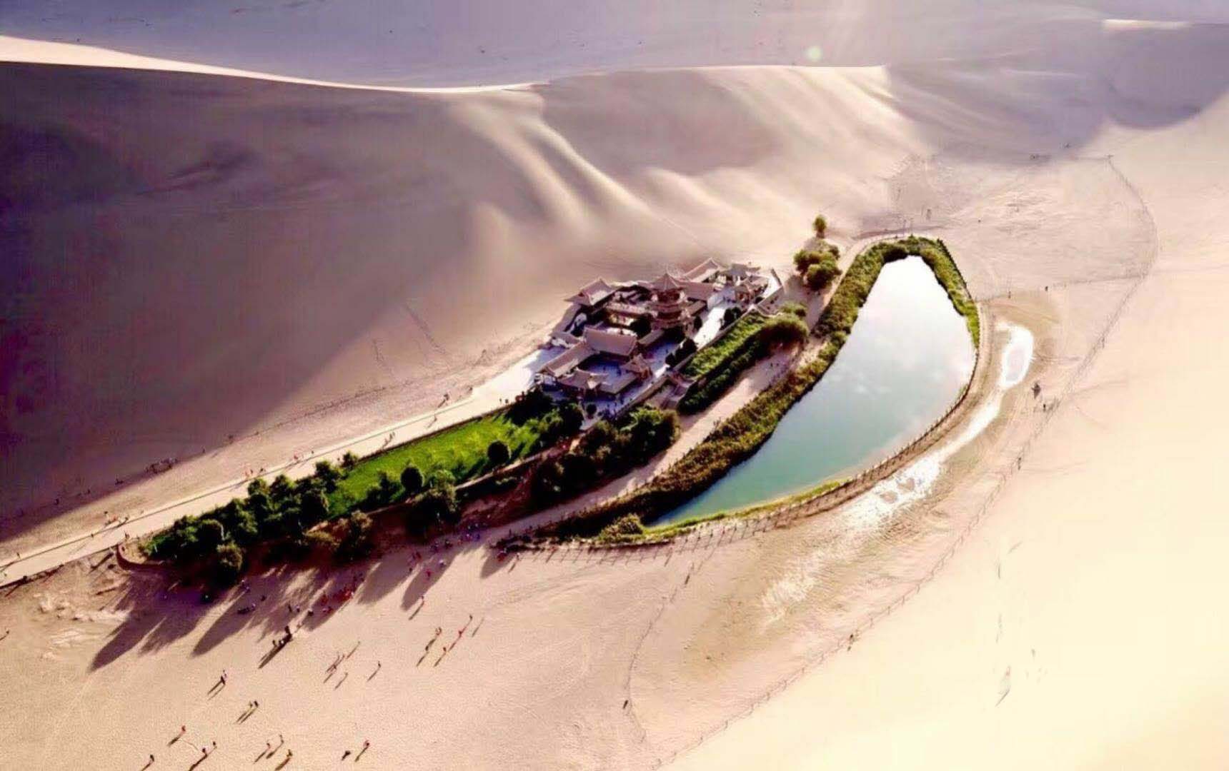 一行人步入鸣沙山之时,正值艳阳高照,30余度的高温却阻挡不了一行人如火的热情,正是应了那句歌词“热情的沙漠”,敦煌对于远道而来的朋友,总是满腹盛情。步入沙地,与天地为伴,沿沙山而上,虽步履维艰却满溢感动。登顶俯瞰鸣沙山,一弯清泉静卧沙湾。历来水火不能兼容,沙漠清泉难以共存,但鸣沙山中,清泉与沙漠相生相伴千年,宛如情侣,不离不弃。若乘滑翔机俯冲而下,在最高点俯瞰,棱角分明的鸣沙山映着清澈的蓝天,撑得起无与伦比的美丽,受得起一切赞誉。
