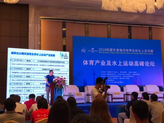 论坛伊始,天津市体育局党委书记、局长李克敏发表热情洋溢的致辞,她指出发展体育产业和水上运动是提高健身休闲产业发展质量和效益,培育壮大各类市场主体,丰富产品和服务供给的重要举措。随后天津财经大学商学院的梁强教授和天津体育学院的叶加宝教授分别就《如何利用天津九河下梢水上资源,做好天津休闲体育运动》以及《体育产业人才培养》进行了主题演讲。