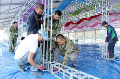位于帽儿山下、海兰江畔北岸的空地,依山傍水、风景独特。之前的萋萋蒿草、盈盈水洼,经过主办方多日的平整,填充,目前场地已平坦整洁,正以全新的面貌迎接盛会及嘉宾的到来。以帽儿山为背景设置的主舞台,目前架体已搭建完毕,LED显示屏、灯光、音响都已安装到位,工作人员将陆续进行调试,并于7月5日进行开幕式演出的节目彩排。主舞台两侧分别搭建起吉林省旅游产品展览会、延边州名优特产商品展销会、延边特色美食节展会的棚房,目前各棚房已搭建完毕,正在设置展位,各参展商将陆续进入各展会棚房进行装修布置。除室内的朝鲜族特色美食展会外,本次消夏节还设有室外特色烧烤区,届时,不仅可以在室内观赏、品尝到1000多道延边特色菜品,还可以在室外体验到别具特色舌尖美味——延边烧烤。