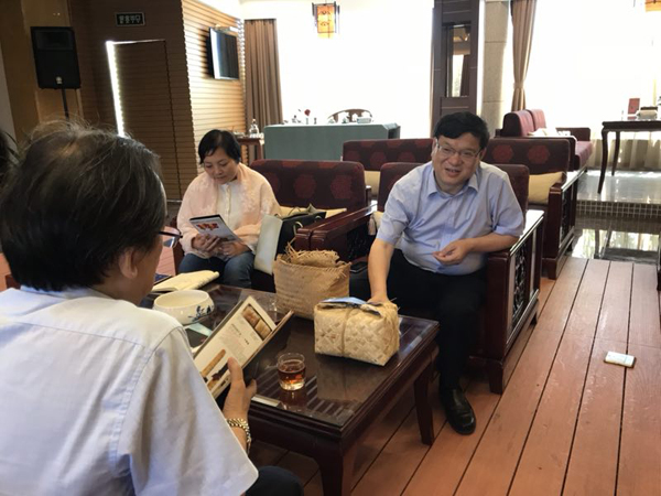湖南省茶业协会会长、湖南省茶业集团董事长周重旺(右一)与香港商报社长助理、香港经济导报副总编辑赵启东(左一)谈湘茶发展历史