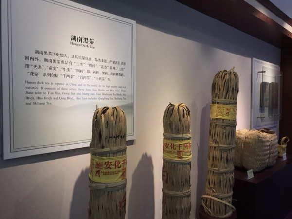 茶叶品牌展示厅陈列的系列产品见证了湖南茶叶品牌发展的历史和辉煌,据湖南省茶业集团副总经理、高级评茶师崔胜茯介绍,目前公司针对欧盟的出口在中国大陆是出口销量最大的。每年9000万美元左右的出口销售量中有2000万美元是对欧盟的出口量,占公司总出口量的1/4。从茶叶生产方面来看,公司的黑茶生产量占居全国第一,从扶贫方面来看,公司联络茶农的规模也是全国第一,一共带动了5000户农户种茶致富。