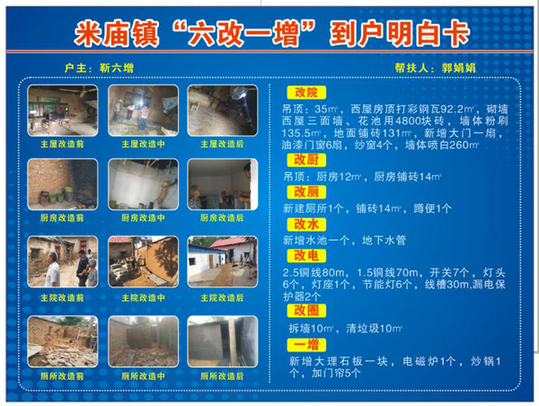 据了解,该镇成立了“六改一增”领导小组,组织各村脱贫责任组、村两委干部、扶贫专干深入调查,对镇内390户建档立卡贫困户挨家挨户实地走访,查看生活环境,最终确定实施建档立卡贫困户“六改一增”项目240户。对照标准,因户施策,为每户贫困户量身定制。逐户建立“六改一增”工作台账。并制作“六改一增”到户明白卡,实行一户一卡,将所有改造的项目都保存改造前、改造中、改造后照片,统一制作六改一增到户明白卡。米庙镇党委书记杨守伟、镇长薛栋杰亲自入户检查,协调问题、督促整改,并要求镇扶贫办及时监督施工质量,督促整改进度,每天汇报改造情况,确保工程保质保量完成。