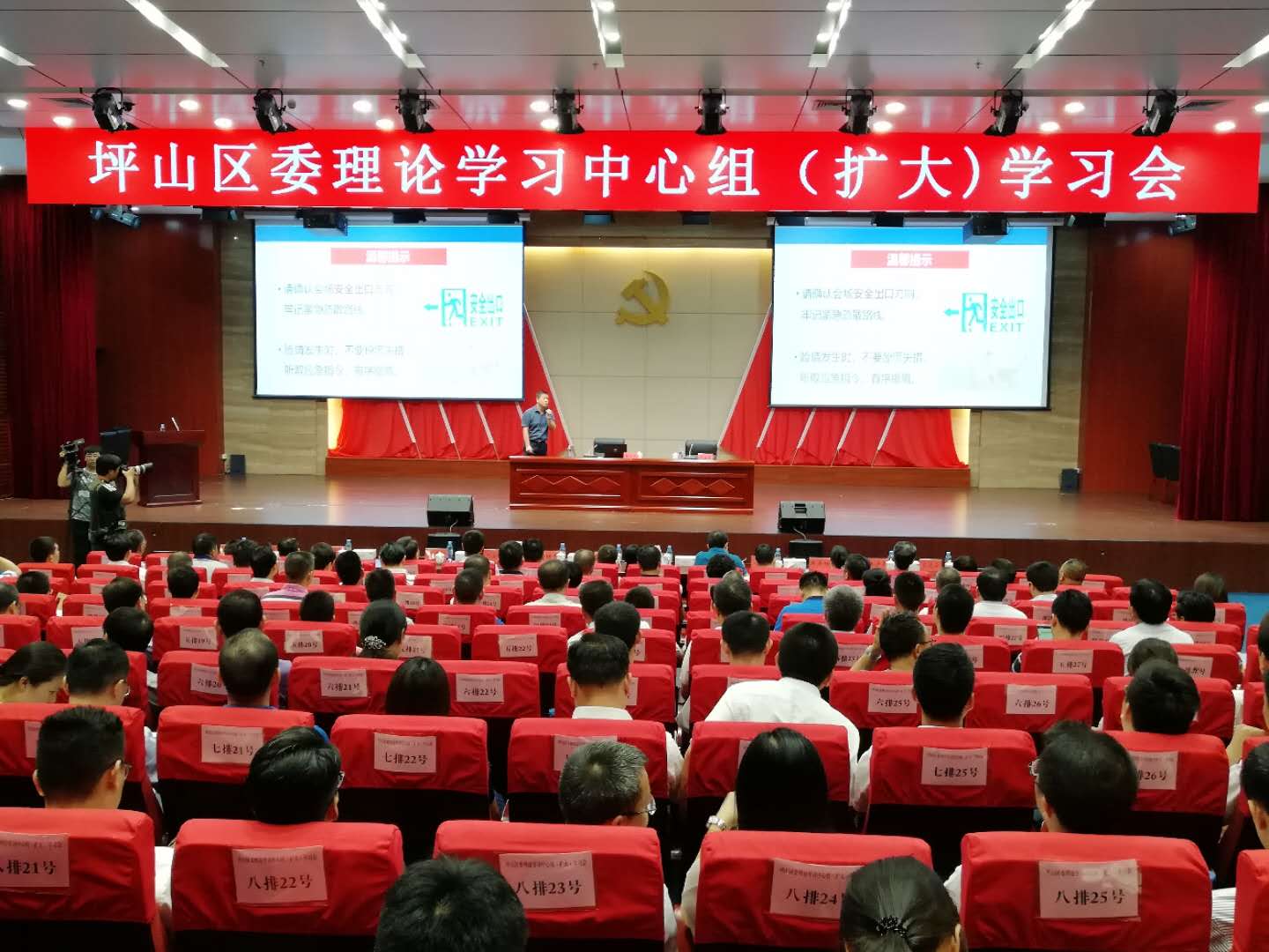 【香港商报网讯】记者焦家志 通讯员刘桂香报道: 7月3日下午,坪山区委召开理论中心组(扩大)学习会,专题学习党的十九大精神,以及党中央、国务院和省、市关于健全和落实安全生产责任制的决策部署,坪山区几套班子领导、全区副科级以上干部以及相关驻区单位、区属企业和党委书记共400余人参加了会议。