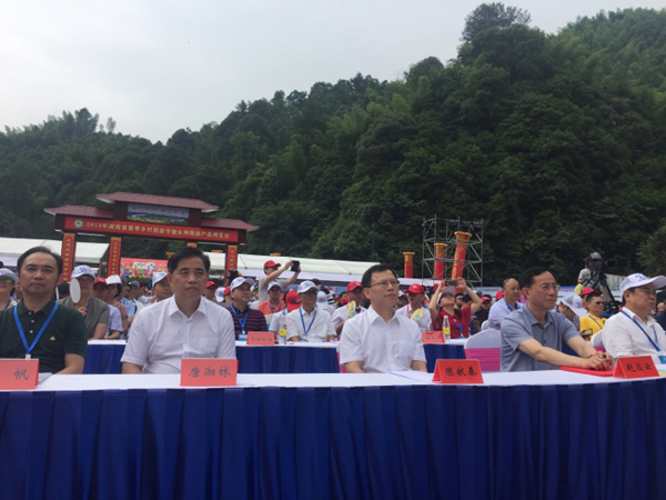 【香港商报网讯】记者唐勇平 李银明 通讯员 严洁 报道: 舜风楚韵,德武东安。7月7日,“相约永州·微游东安”2018年湖南夏季乡村旅游节在东安县舜皇山森林公园开幕。湖南省旅发委主任陈献春等省市县相关领导出席开幕式。永州市委副书记唐湘林主持开幕式。省、市、县领导共同启动东安号高铁引擎,共同为旅游节开幕。