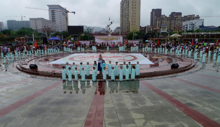 7月7日,在广西柳州市融安县长安广场,身着汉唐服饰的小朋友们在颂读《弟子规》。覃庆和 摄