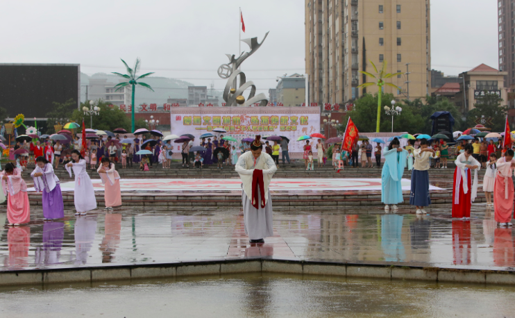 7月7日,在广西柳州市融安县长安广场,身着汉唐服饰的市民在行礼仪。覃庆和 摄