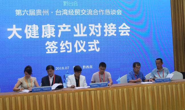 在大健康产业对接会上,台湾锦福国际健康管理有限公司分公司--贵州锦上福健康管理有限公司与黔西南州卫计委签约黔西南州健康管理中心项目涉及金额1亿元;台湾后里兰园与安龙金惠花卉发展有限公司签约花卉培养与产销项目涉及金额9000万元;台湾大福商贸有限公司与义龙新区经济发展局签约咖啡种植与加工项目涉及金额5000万元;普安县泉农茶叶发展有限公司与普安政府签约茶叶种植、加工、销售项目涉及金额1.5亿元;台湾大晶华国际有限公司与与贵州海福农业签约魔芋精粉出口贸易协议涉及金额4000万元;厦门玖布网络科技有限公司与贵州兴黔农旅商贸有限公司签约贵州龙广退役军人创业示范营地--医养项目涉及金额4亿元;深圳市前海堃元智慧有限公司与贵州省黔西南州养老产业开发投资有限责任公司签约涉及金额10亿元。据悉,此次签约项目台湾投资合计约18.3亿人民币,此次签约项目落地后,将进一步促进黔台两地大健康产业合作与发展。