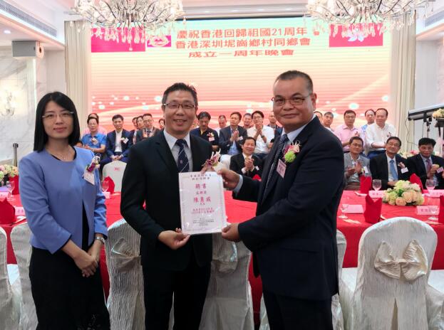陈勇威担任香港深圳坭岗乡村同乡会的名誉顾问。在深圳罗湖区统战部副部长郑重(左)陪同下,香港深圳坭岗乡村同乡会会长曾建科(右)向陈勇威(中间)颁发委任状