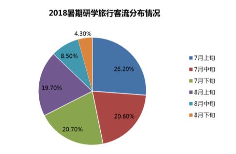 随着研学概念的迅速普及,研学旅行几乎成为城市中产家庭未成年子女的暑期必修课。《报告》提供的最新调研数据显示,今年暑期城市居民家庭中有研学旅行计划的比例接近10%,相比去年同期提升了近一倍。出游时间分布方面,今年的暑期研学旅行客流量主要集中在7月初至8月上旬,整体客流占比87.2%。