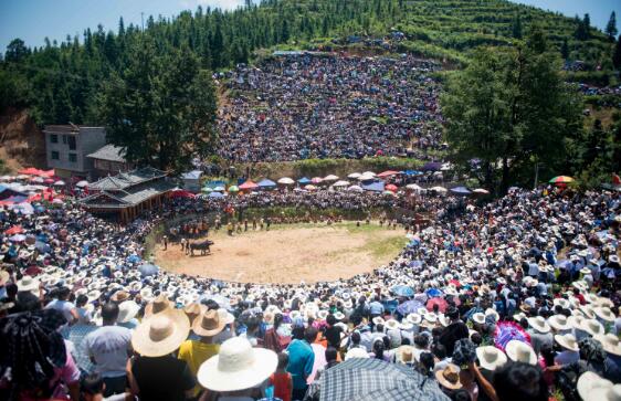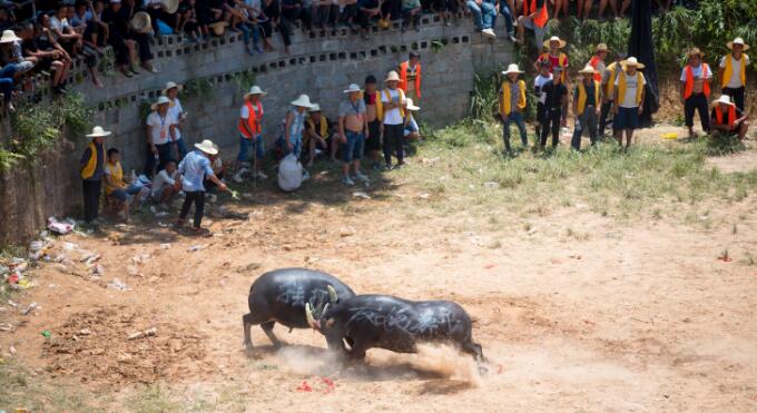 贵州省从江县东朗镇松刀斗牛塘,人们在观看斗牛。 吴德军 摄
