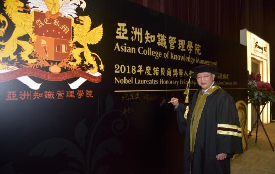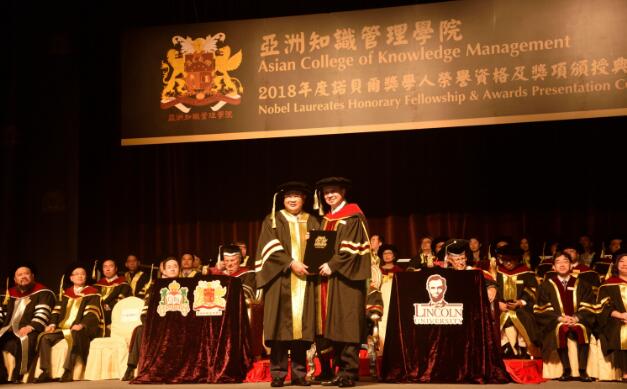 【香港商报网讯】记者黄凤鸣 报道:亚洲知识管理学院“2018年度诺贝尔奖学人荣誉资格及奖项颁授典礼”日前在香港亚洲国际博览馆举行,香港特别行政区商务及经济发展局副局长陈百里博士、全国政协委员高永文医生、加拿大特许管理学院荣誉院长亚瑟汉米敦教授及林肯大学荣誉校监李察奥利森教授担任主礼嘉宾,共88位来自不同界别的精英翘楚及5间杰出企业获颁授殊荣。其中,伟禄集团控股有限公司 ( 股票代码︰1196 ) 主席林晓辉博士荣获亚洲知识管理学院院士名衔。