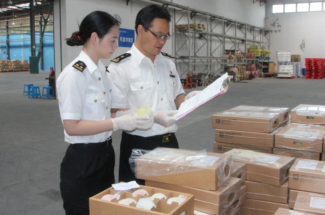 海关在查验水蜜桃。 成科珂摄