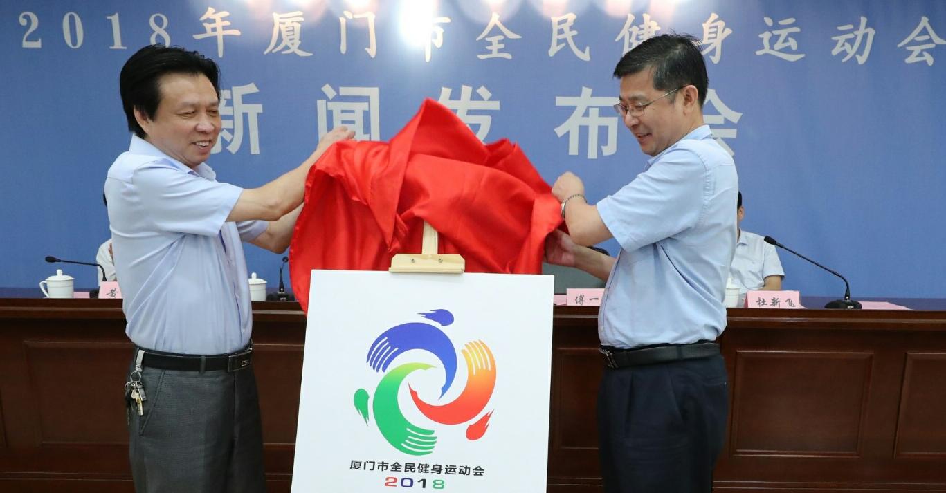 厦门市体育局局长傅一民与厦门日报社副总编辑汪金铭共同揭晓了2018年厦门市全民健身运动会的会标。