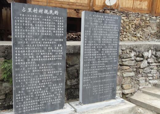 行走在占里村的古老巷道,古香古色的屋板壁上随处看见刻写着“盗贼由自贫困起,人地均衡才富足”、“儿子多了无田中,娶不了媳妇;女儿多了无银两,嫁不了姑娘”、 “一棵树上一窝雀,多了一窝就挨饿”……等等村民们世代传唱的古歌古训以及寨规款约。